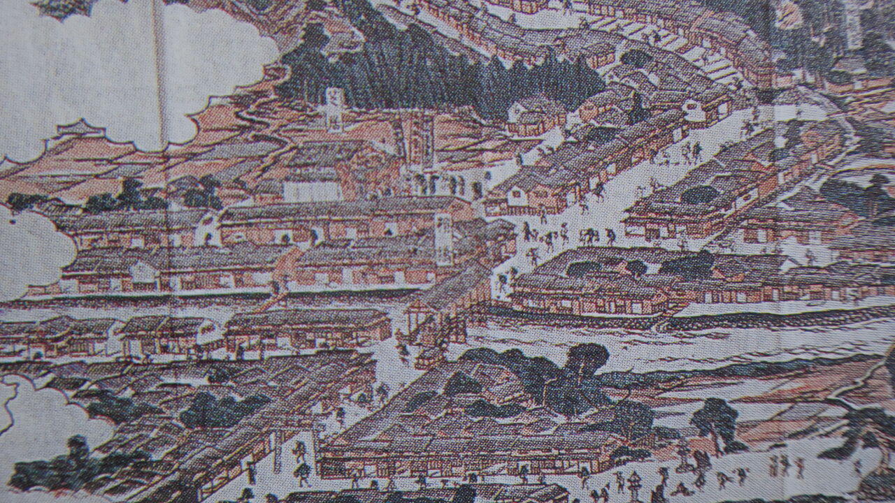第9図A地点を見ると、それに備えて二つのT字路が造られていのが見て取れます。また道幅は狭く、十字路の多くは筋違いになっているため周囲の眺望がききません。砂嘴が湾曲していることもあって見通しが効かず、よそ者は道に迷いやすい街並みです。これらは城下町として、生駒氏が意図的に造りだした可能性が高いと研究者は考えているようです。