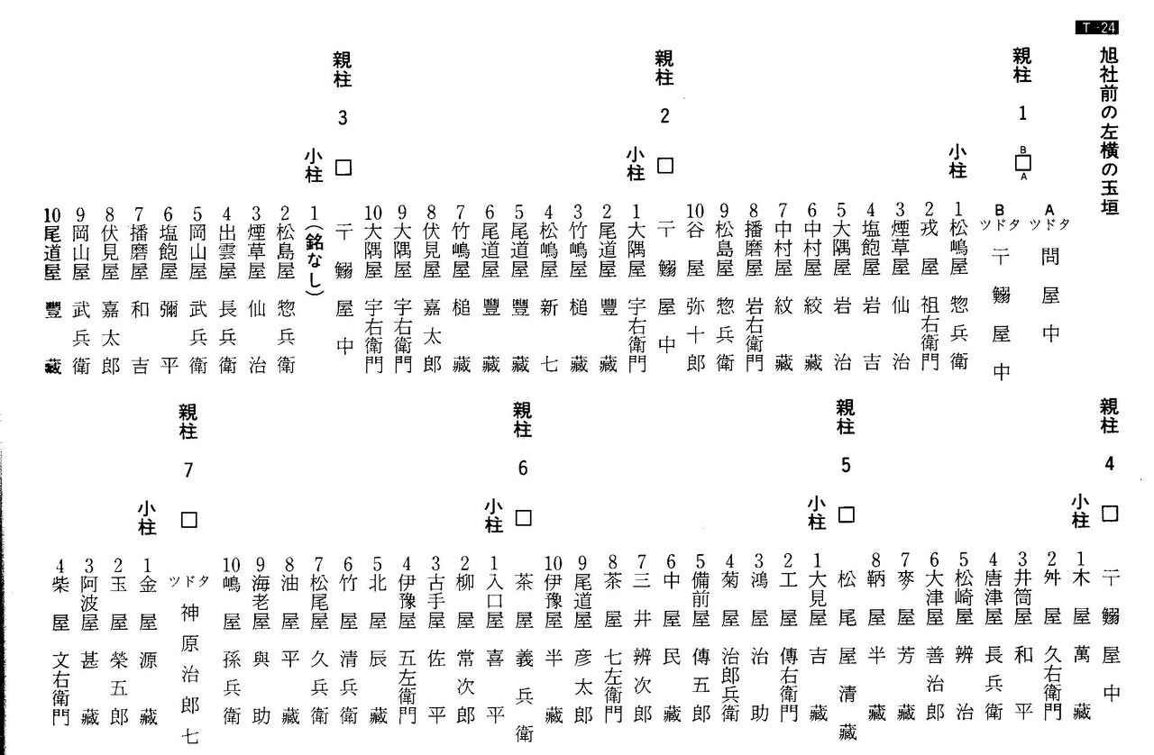 第7図は、研究者が地域の人たちからの聞取調査で作成した「町」の範囲のようです。「松の下」と「魚の棚」がひとつになって「松魚」と呼ばれたりして正確でない所もあるようですが⑧の両側町のスタイルであることが見て取れます。