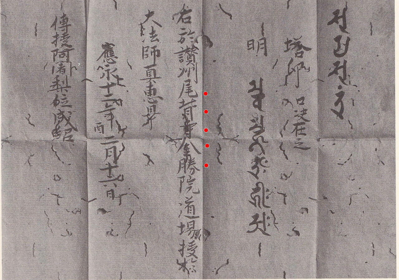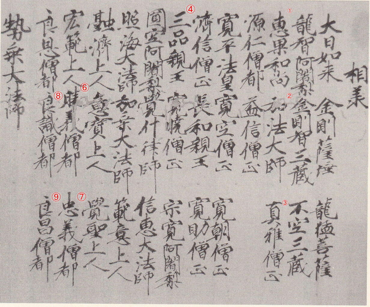 上の史料は「良恩授慶祐印信」と呼ばれる真言密教の相伝系譜です。そのスタートは大日如来や金剛菩薩から始まります。そして①長安の惠果 ②弘法大師 ③真雅(弘法大師弟)と法脈が記されています。この法脈の実際の創始者は④の三品親王になるようです。それを引き継いでいくのが⑥勝義 ⑦忠義の讃岐岸上出身の師弟コンビです。さらに、この法脈は⑧良識 ⑨良昌に受け継がれていきます。⑨の良昌は、飯山にある島田寺の住職を兼ねながら高野山金剛三昧院住持を勤めた人物です。