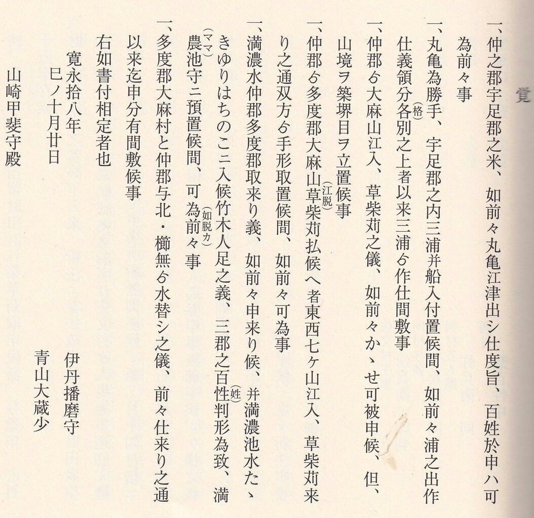 一、那珂郡と鵜足郡の米は、前々から丸亀湊へ運んでいたが、百姓たちが要望するように従前通りにすること。一、丸亀藩領内の宇足郡の内、三浦と船入(土器川河口の港)については、前々より(移住前の宇多津の平山・御供所の浦)へ出作しているが、今後は三浦の宇多津への出作を認めないこと。一、仲郡の大麻山での草柴苅について、前々から行っていたと云う。ただ、(三野郡との)山境を築き境界をつくるなどの措置を行うこと。一、仲郡と多度郡の大麻山での草柴苅払に入る者と、東西七ヶ村山へ入り、草柴苅りをおこなうことについて双方ともに手形(鑑札札)を義務づけることは、前々通りに行うこと一、満濃池の林野入会について、仲郡と多度郡が前々から入山していたので認めること。また満濃池水たゝきゆり はちのこ採集に入ること、竹木人足については、三郡の百姓の姿が識別できるようにして、満濃池守に措置を任せること。これも従前通りである。一、多度郡大麻村と仲郡与北・櫛無の水替(配分)について、従来通りの仕来りで行うこと。右如書付相定者也寛永拾八年 伊丹播磨守巳ノ十月廿日 青山大蔵少山崎甲斐守殿