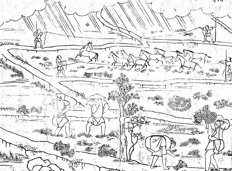 古代には刈敷の草木を刈り取るのは、条里制内の耕作放棄地(年荒)や常荒田と、条里制周辺の未墾地でした。これらの土地は、荘園主などの領主の所有地ですので、農民は人山料を支払って刈り取っていたようです。