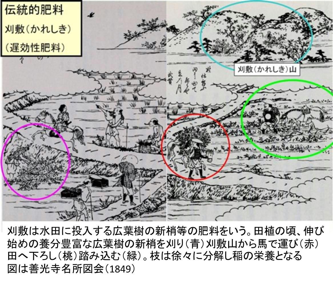 ①中世には田んぼに大量の小枝をすき込む刈敷が行われ肥料とされた。