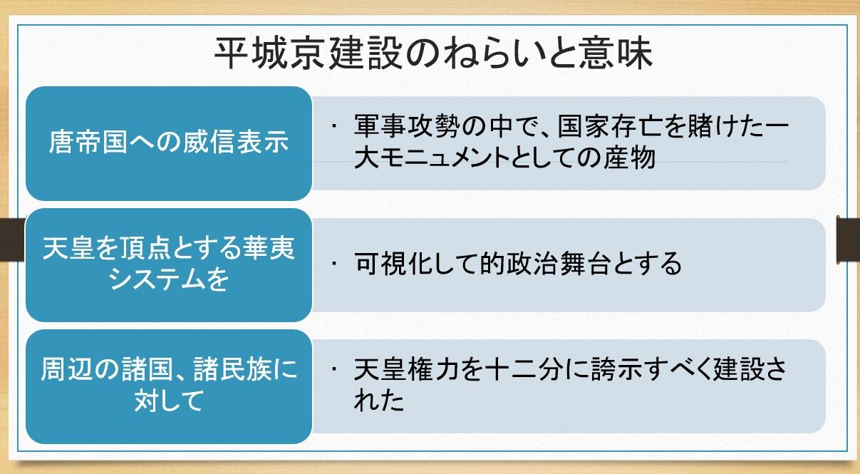 ①唐の圧倒的な軍事攻勢の中で、国家としての存亡を計ろうとした天武政権によって築造された。②独自の華夷システム=天皇を頂点として、隼人、蝦夷、新羅、のちには渤海を夷狄や蕃国として位置付ける統治システムを目に見える形で示す政治的な舞台としての役割が込められた。③唐に極力配慮しつつも、周辺の諸国、諸民族に対して天皇権力を誇示するシンボルモニュメントが平城京だった