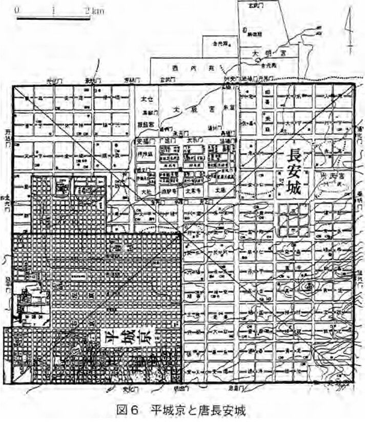 平城京は南北に長い矩形に見えるので、横に長い長安城とはスタイルが違うようにみえます。しかし、上図のように長安城の4分の1の横長の矩形を90度回転させると、平城京と一致すると研究者は指摘します。また平城京の朱雀大路は幅が75mで長安城の朱雀街の1/2までに広くなっています。