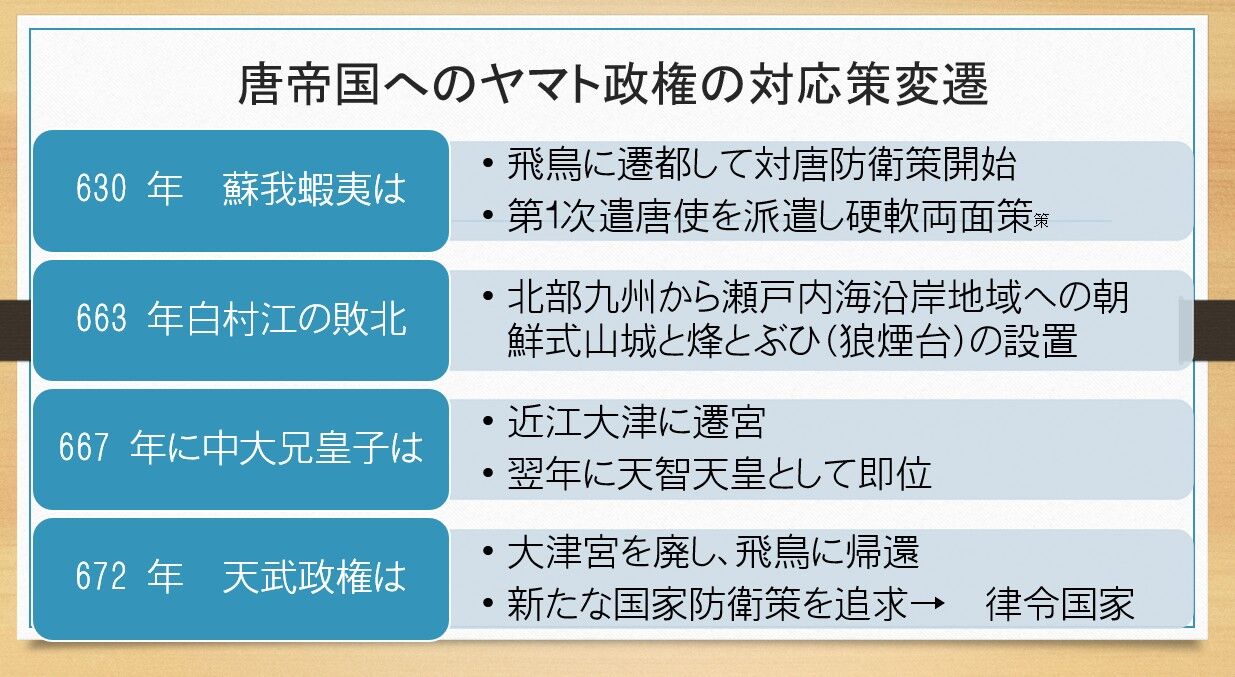 このヤマト政権の飛鳥への遷都も、高句麗と同じ対唐防衛策であったと研究者は考えています。