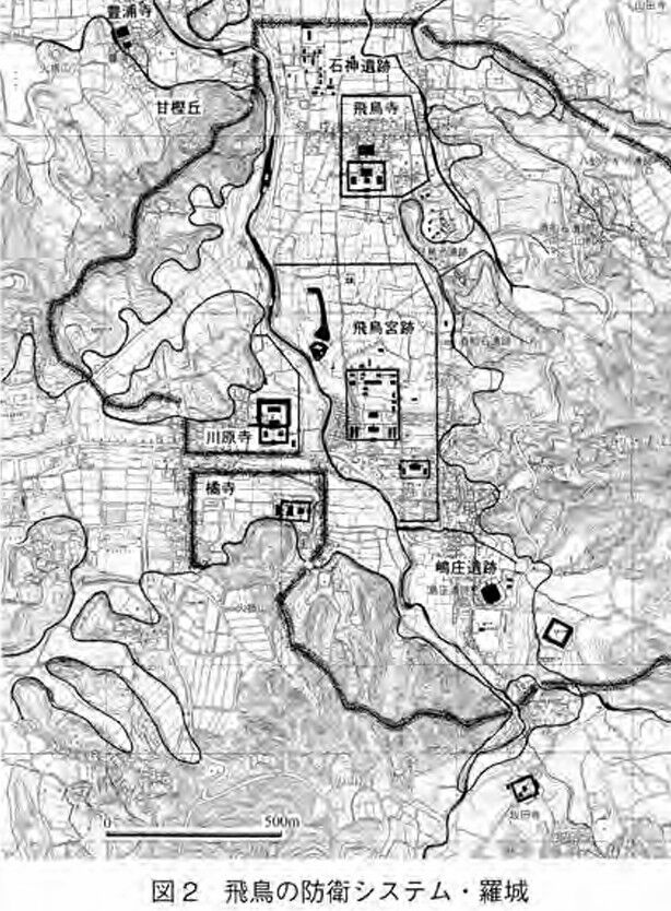大和飛鳥でも上図のように王宮と後飛鳥岡本宮を取り囲む丘陵の尾根に沿って長大な掘立柱塀を設置するなど、防御施設の営造が進められます。飛鳥の周囲にも山城が設けられたとみる研究者もいます。
