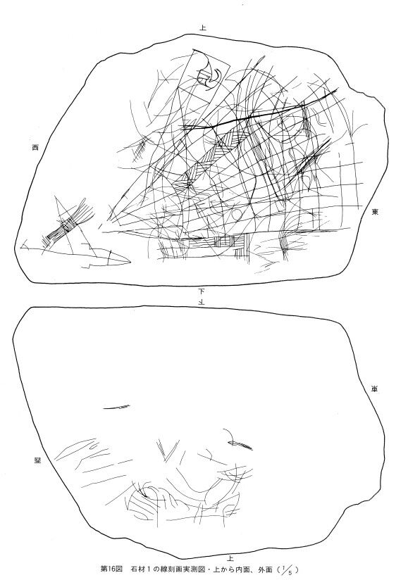 鼻や口の表現はやや暖味であるが、両耳は比較的はっきりしている。顔の入れ墨についても目を基調に施されており、この人面文の周囲にも目だけの表現らしいものが多く認められる。また、石材2の内面にも人面文が認められるが、これは顔の輪郭と目だけの表現であり、やはり人面文は目が呪的な力を発揮するようである。