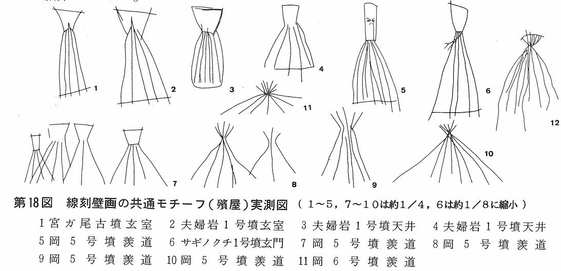 また善通寺市内には、線刻画で有名な宮が尾古墳があります。それ以外にも10基あまりの後期古墳に線刻画が描かれています。仙遊遺跡の箱式石棺は、最も古い直弧文系図文によって装飾された墓になります。墓に呪的な線刻による装飾を施すことが弥生時代後期には成立していたこと、その線刻画古墳の原型が仙遊遺跡の箱式石棺であることを押さえておきます。 善通寺周辺の線刻画の共通モチーフ 殯屋(もがりや)?