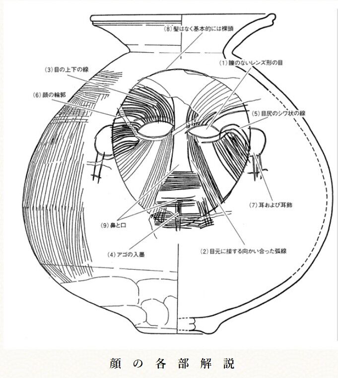 ②その中の人面文様は、入墨があり、瞳のない眼によって悪霊をにらみつけて退散させる辟(=魔除け)の思想がうかがえる。