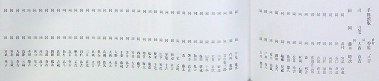 頭取 琴平の藤本茂助 その手附に、西京8、近江国2名、大阪4名、高松1名、当村2名の計17名頭取 大坂の大西仙助 その手附に、大阪から11名、西京から4名の計15名