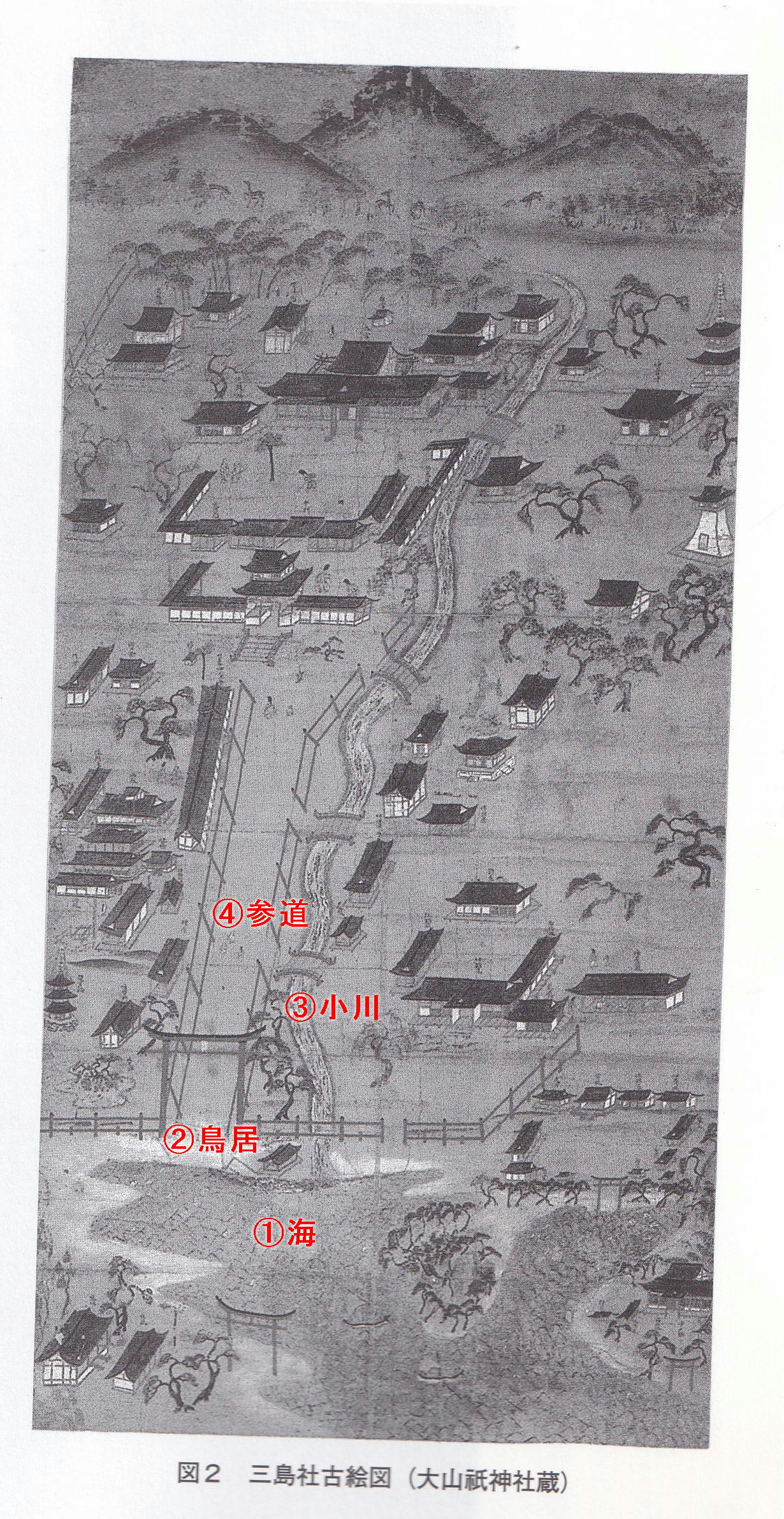 ①一遍上人絵伝の三島社の表現は、自然景観や社殿の配置については比較的正確に描いている