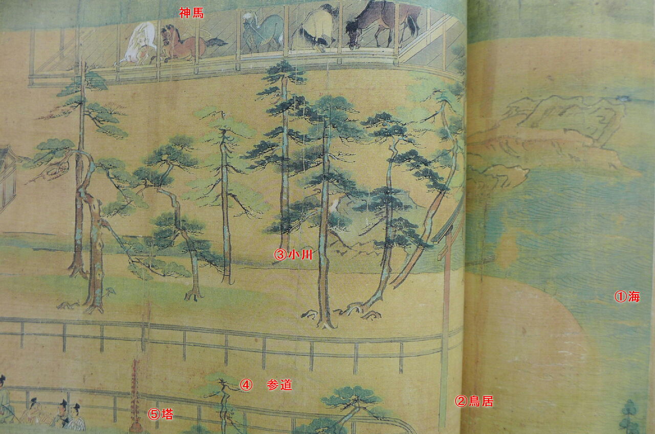 この絵図を見るとまず気がつくのは、門前にまで海が迫り、上陸するとすぐ大きな鳥居があることです。船でやってきた参拝者は、船を砂浜に乗り、鳥居をくぐって参道を歩き始めることになります。これは現在の景観とはかけ離れているかのように思えます。現在の神社は海辺からはかなり離れているからです。今は港に上陸した人々は、門前町の街並みを500mほど進んでから神社の人口に達します。しかし、この門前町の一帯が、「新地」と呼ばれています。港からの門前町は近世の開発地なのです。地形復元すると、中世には参道の入口まで波が寄せていたようです。実際、室町期の古絵図でも参道入口の鳥居まで海が迫っている状況が描かれていることが確認できます。これらのことを考えれば、『聖絵』は当時の海と社地の関係を比較的正確に描いていると研究者は考えています。