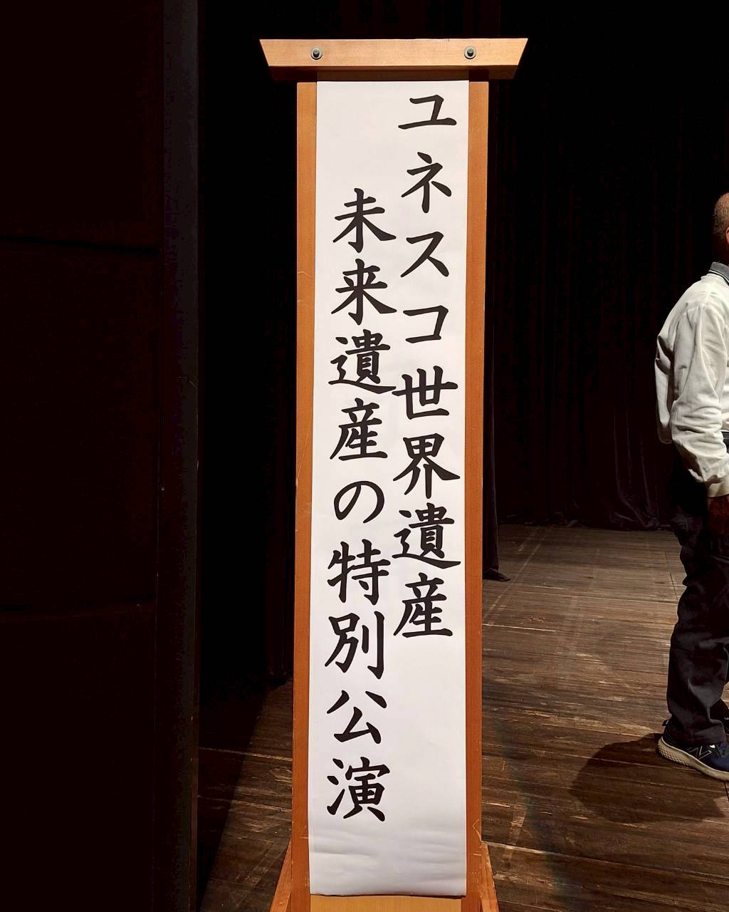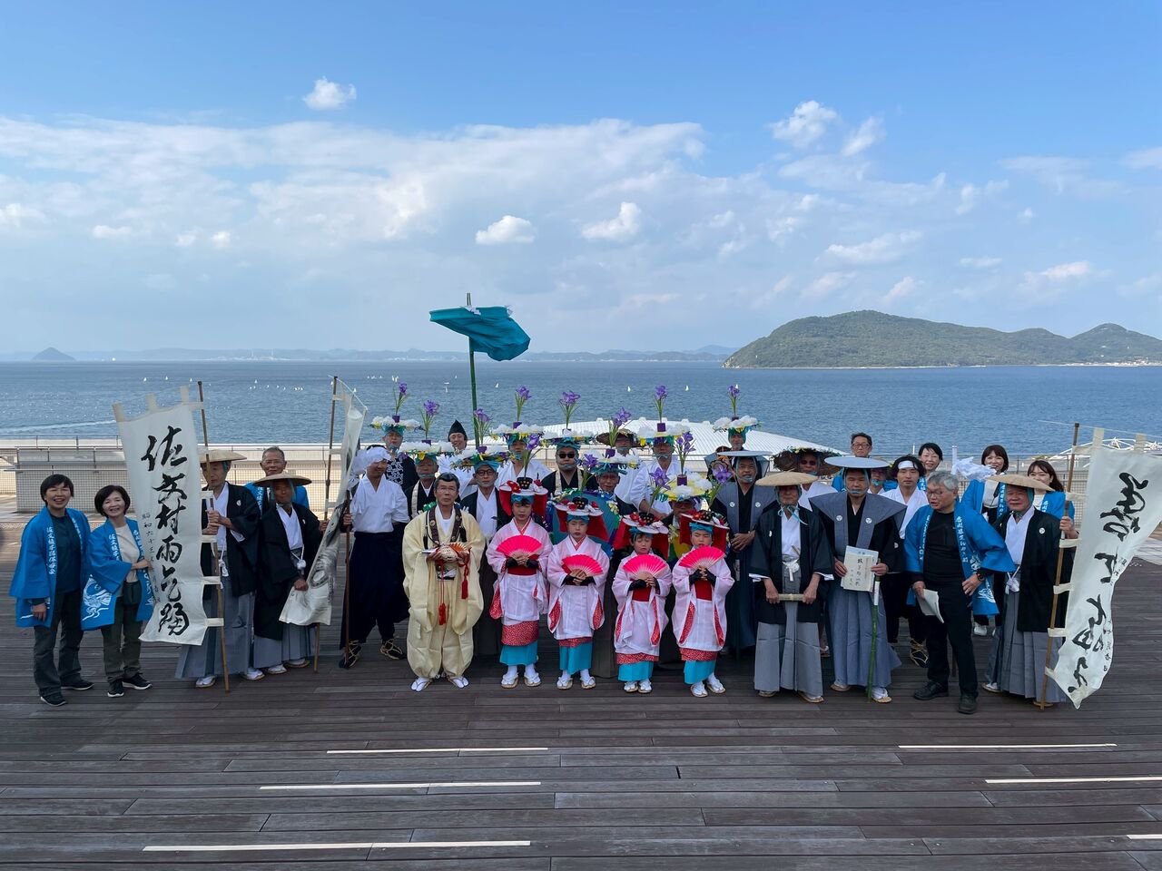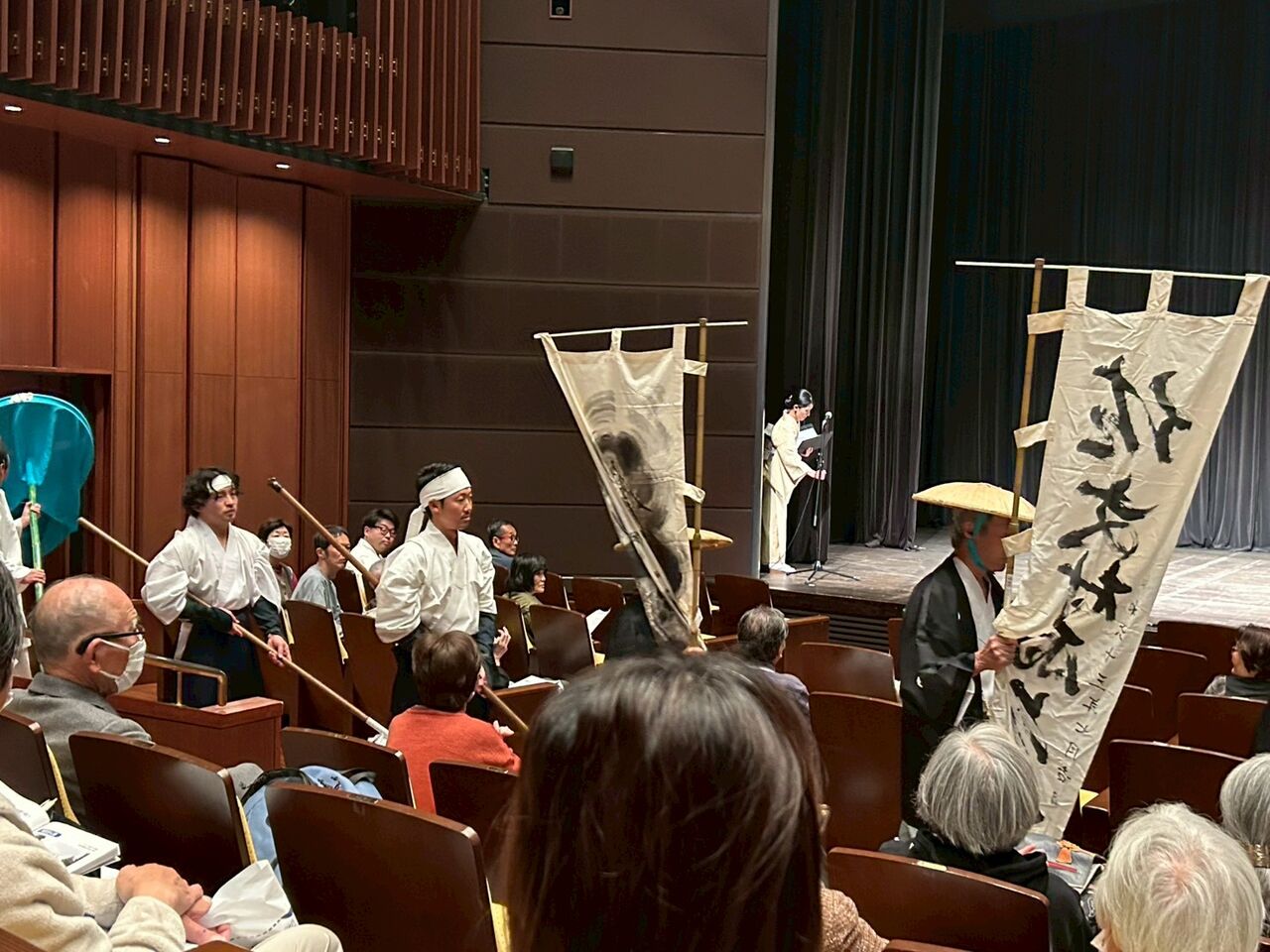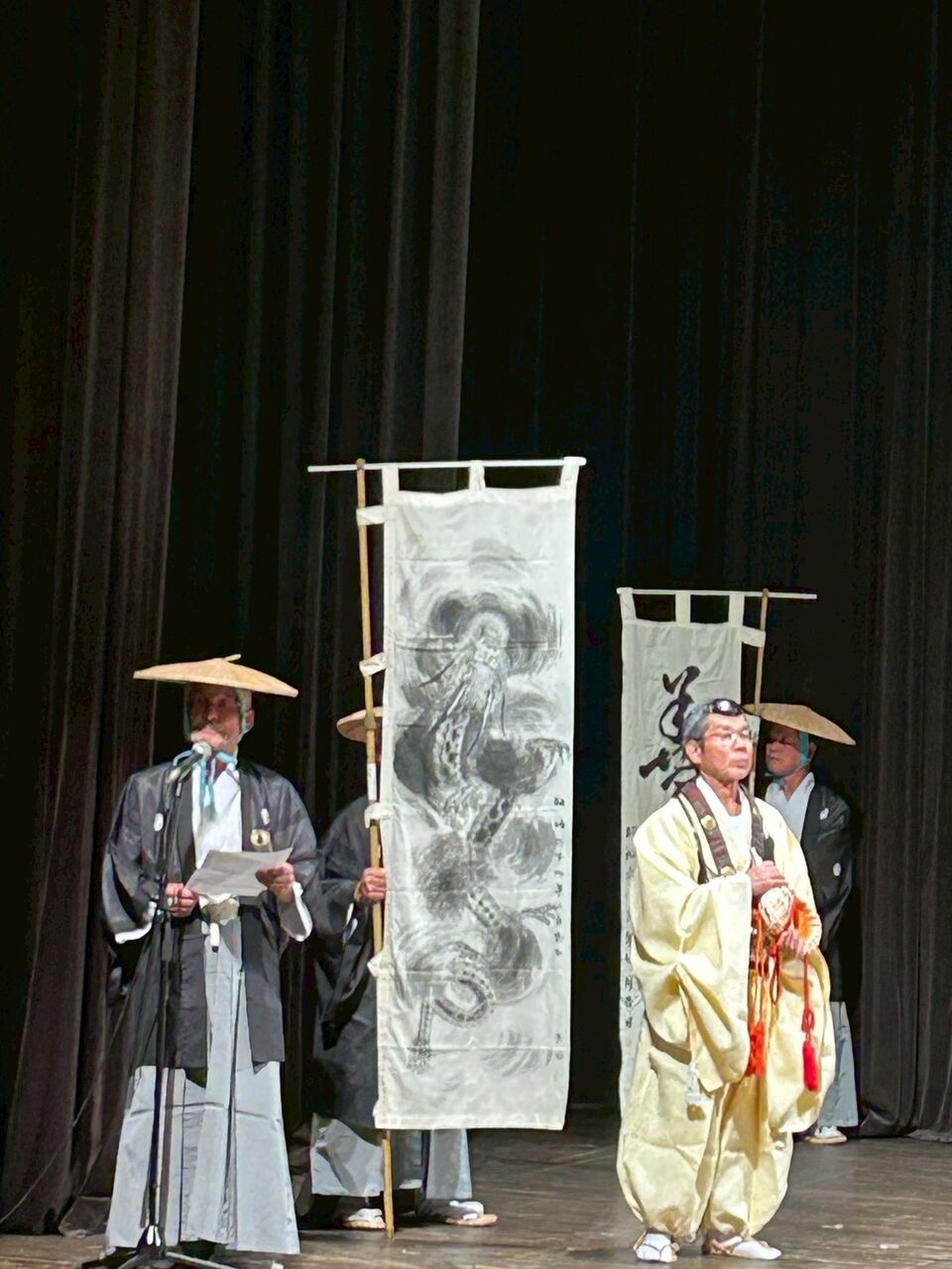 今回は次のように簡単な役割紹介をしました。こんにちわ まんのう町の綾子踊保存会会長の白川です。髙松ユネスコ協会創立五十周年 誠におめでとうございます。この式典に呼んでいただいたことをありがたく思っています。私たちの住むまんのう町佐文は金毘羅さんが鎮座する象頭山の南側にある小さな盆地で、百四十軒ほどの集落です。水利の便が悪く、香川用水が通じるまでは水不足に悩まされてきました。その歴史は、日照りとの闘いの歴史でもありました。そこで踊り継がれてきたのが綾子踊りです。笛・鉦・太鼓・鼓・法螺貝などに合わせて踊る姿は、中世の風流踊りにつながるものとされています。綾子踊りを踊ることは、佐文地区に住む私たちにとっては、故郷に生きる証のようなものです。この踊りを途絶えることなく次世代へ伝承していきたいと思っております。髙松ユネスコ協会のますますのご活躍を祈念しながら、本日は踊らせていただきます。