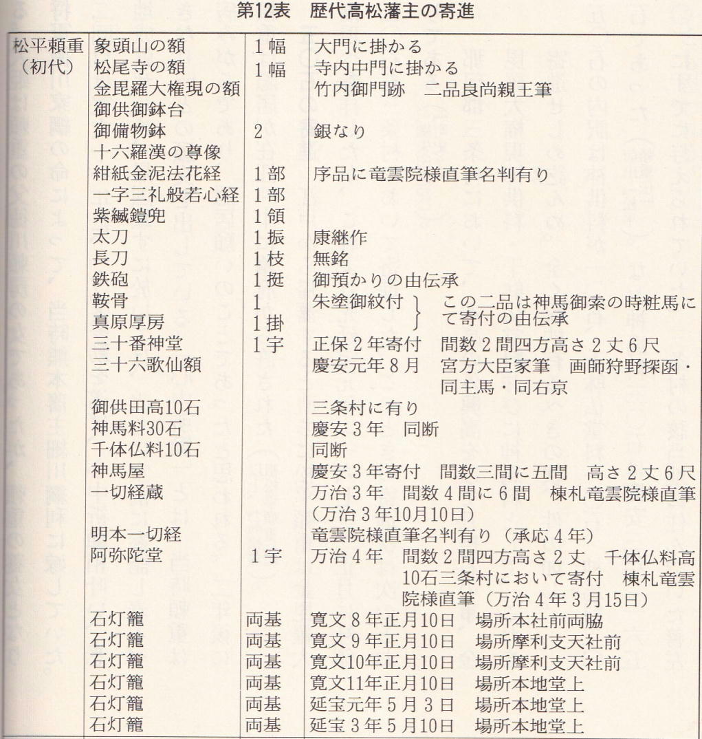 ここからは1673年に松平頼重が、仲郡三条村で神馬料高30石・千休仏頷10石・御供田10石、合計50石を寄進したことが分かります。この中の「御供田(ごくでん、おともだ、おくだなど)」とは、神仏に供えるお米(神饌米)を栽培するために使われた田んぼのことです。寛文十三(1673)発丑年霊元天皇御宇一、正月十日讃岐高松城主松平讃岐守頼重、那珂郡三条村に於て、御供領、不体仏堂領、神馬領として、高五十石を献ず