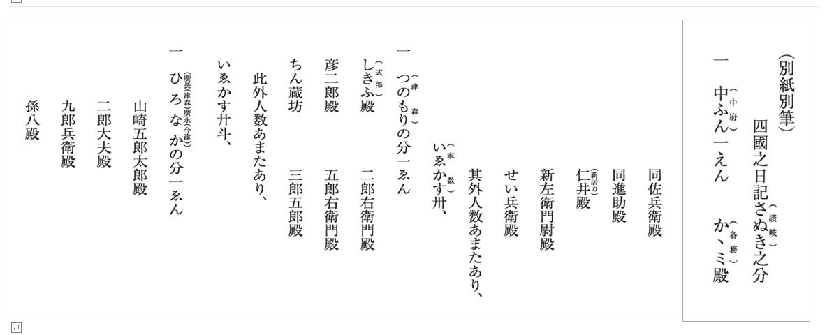 雖度々令啓達候、向後之儀猶以可得御内証、態以使者申人候、(中略)一(3)先度従在陣中如令注進候、讃州十河・羽床両城取詰而落居半、大坂を逃下牢人共紀州・淡州相催、阿州勝瑞へ被渡及再籠、一 名東郡一宮之城を取巻候之条、十河・羽床搦手にハ対陣付置、一宮為後巻至阿州馳向候処、此方備まちうけす敵即敗北候、追而可及一戦処、阿州南方に在之新開道善と申者をはじめ雑賀之者に令同心、大都敵心之輩依在之軍利難計、先謀叛之輩共、或者令誅伐、或令追討、勝瑞一所に責縮、方角要々害・番手等堅固申付、一旦休汗馬候、敵方手成於武篇者手二取見究申間、可御心易候、一(4)先度之御報に紀州者阿州無競望様二可被仰上之旨、尤大慶存候、既今度彼等謀略之状懸御目候、殊四国行之段御朱印頂戴仕旨、厳重申洩依致蜂起、万一如何様仁被成 御下知候哉と一先戦申加遠慮候、迪之儀詳に被仰上、委曲之御報所仰候、一(5)阿・讃於平均者、雖為不肖身上西国表御手遣之節者、随分相当之致御馳走、可詢粉骨念願計候、一(6)三好山城守(康長)近日讃州至(寒川郡)安富館下国必定候、子細口上可申分候、一(7)淡州野口方(長宗)ノ所来、其元馳参被成御許容候由候、此比淡州之儀、如何可被仰付候、御模様候哉承度存候、紀州之儀被押置候者、阿・讃両国即時被及行可相呆候条、於其上者淡州之義、被(中略)長宗我部宮内少輔 元親(天正八年)霜月廿四日羽柴筑前守(秀吉)殿人々御中