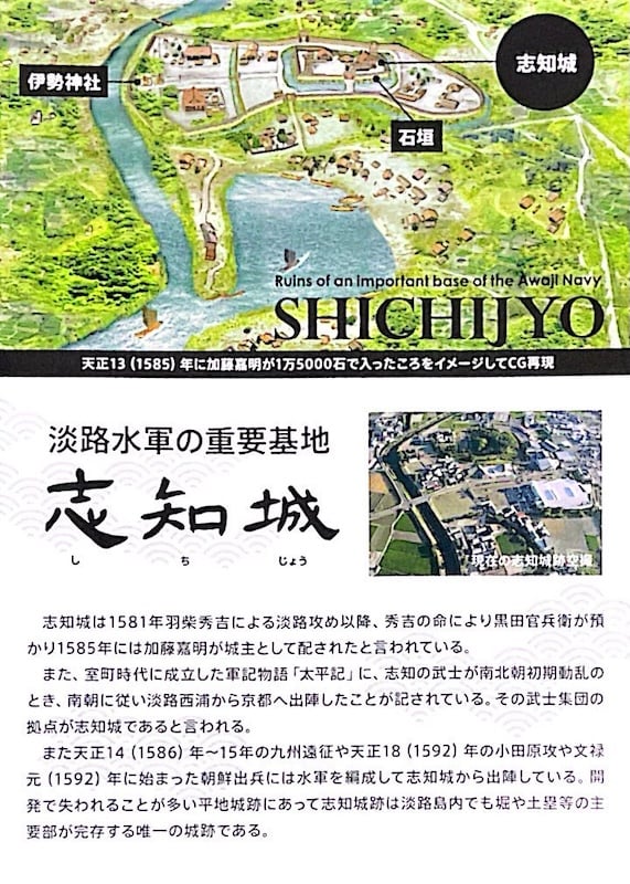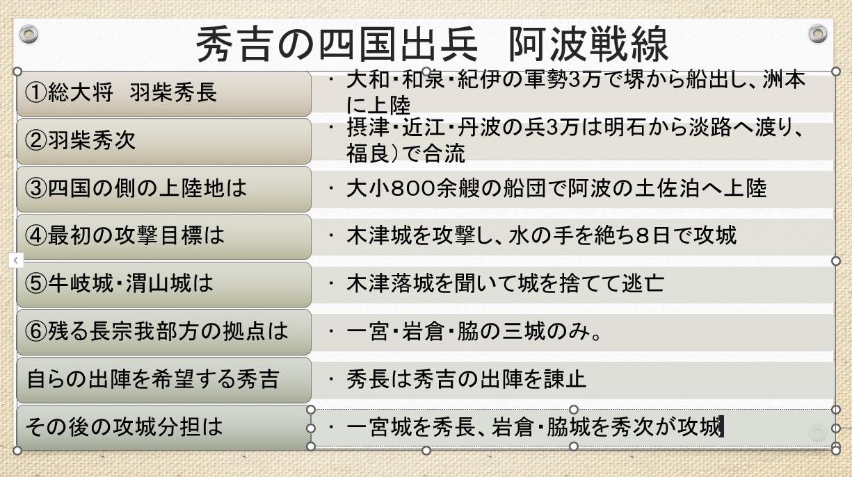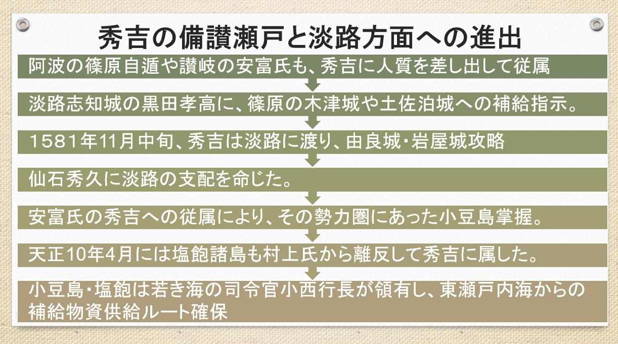 ここからは秀吉が淡路侵攻し、洲本の安宅氏(神五郎)を服属させて、人質を取ったこと。また野口孫五郎(長宗)に「三原之古城」(志知城)の普請を命じたことが分かります。こうして淡路は羽柴勢によって平定され、織田信長のもとに置かれたと研究者は判断します。