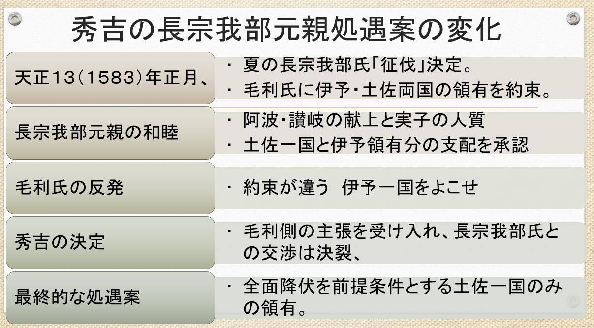 一(3)讃岐については、阿波勝瑞が落ちれば、自然と平定は進むと思われます。讃岐衆は、当分は長宗我部方へ敵心を抱くかもしれませんが、遺恨はありません。また中国筋(備中遠征)をめぐって毛利氏とは敵筋になっています。それらから考えて、勝瑞が落ちれば、讃岐のことは如何ようにもなります。連々調略子細候間、一握にて済みましょう。