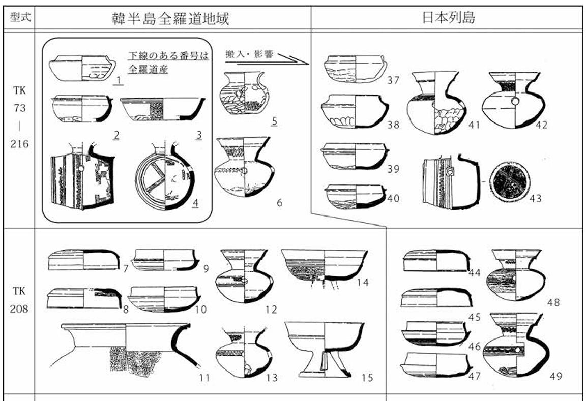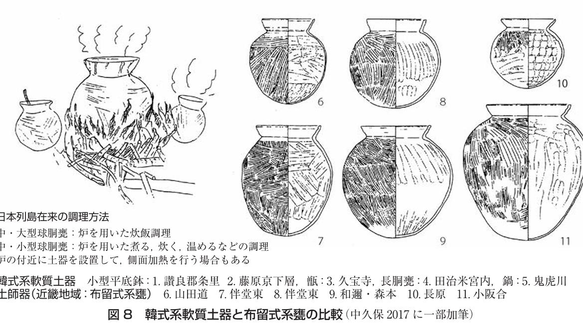 「器形や製作技法が三国時代の韓半島南部地域にみられる赤褐色軟質土器に酷似したもので、長胴甕、小型平底鉢、甑、鍋など、日常の調理に用いられた器種を主体とする土器群」( 田中清美2005「河内湖周辺の韓式系土器と渡来人」『ヤマト王権と渡来人』大橋信弥・花田勝広編 サンライズ出版)