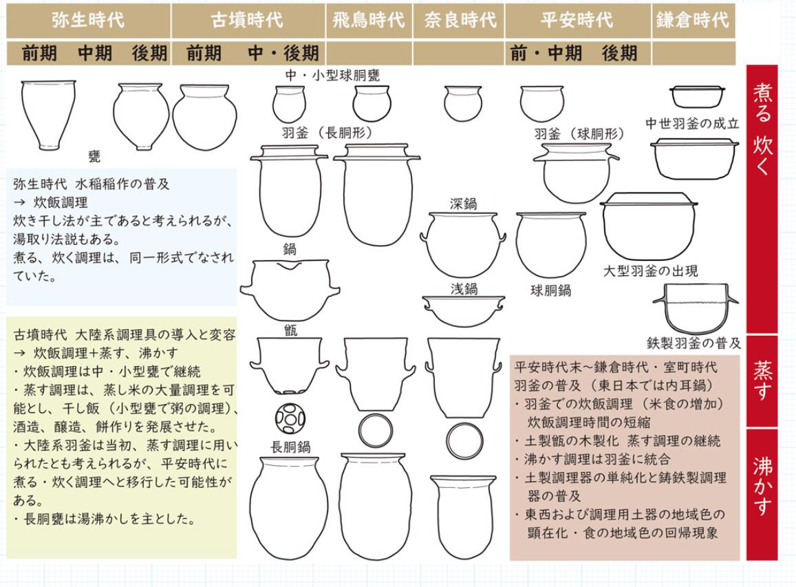 ①カマドの前において調理された小型平底鉢②食器の一種としての把手付鉢、平底鉢③カマドにかけて湯沸かしに用いられた長胴甕④同じくカマドにかけられた羽釜はがま⑤大人数のために煮込み調理などがなされた鍋⑥厨房道具としての移動式カマド⑦蒸し調理に用いられた甑こしき⑧北方遊牧民族の調理具である直口鉢(?ふく)⑨カマド全面を保護するためのU字形カマド枠