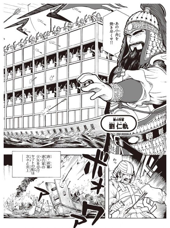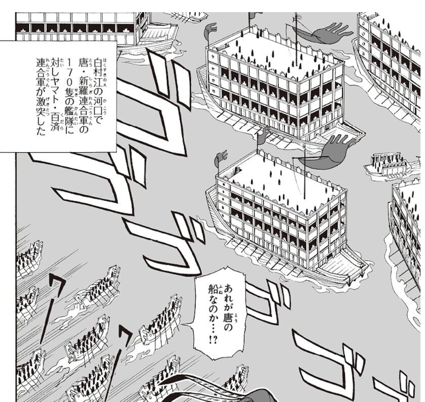 *(8 月17日) 賊の将軍(新羅の将軍)は州柔城(百済復興軍の本拠)を囲み、大唐の将軍は軍船 170 艘を率いて白村江に陣取った。*(8 月27日)倭国の軍船うち最初に到着したものと大唐の軍船が出会って戦争に なった。倭国軍は負けて退却して、大唐は守りを固めた。*(8 月28日) 日本の諸々の将軍と百済王豊璋は状況を観ずに、語り合って言った 。「我らが先に戦争を仕掛ければ、彼らは自然と退却するでしょう」と*①倭国軍は統率が乱れながら兵卒を率いて進んだ。大唐軍は陣を硬くして 、左右から船を挟んで囲んで攻めた。須臾之際(あっという間に)、倭国軍は破れた。水に落ちて溺れて死ぬ者が多かった。