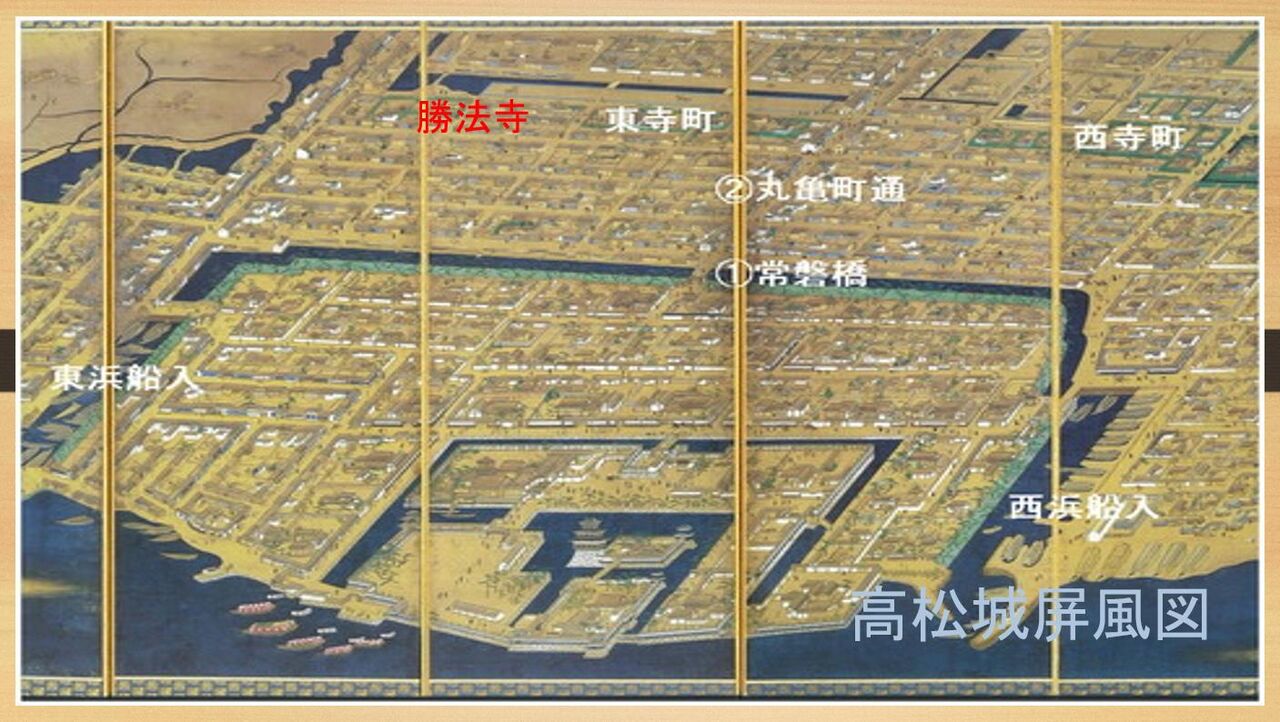 髙松城屏風図とよばれている4枚の屏風図です。水戸からやってきた松平頼重やそのブレーンは、この屏風図を見ながら城下町の改造計画を練ったのかもしれません。現在の市役所がある西寺町から東寺町にかけて東西にお寺ぶエリアが置かれていました。これは高松城の南の防衛ラインの役割を果たし、緊急事態の折には各侍達はどこの寺に集合するのかも決められていたと云います。