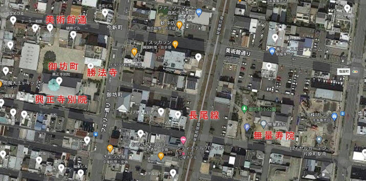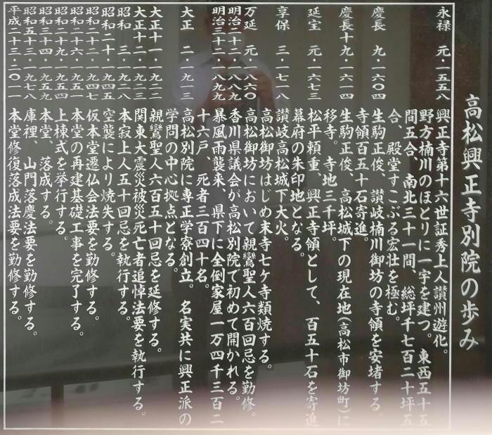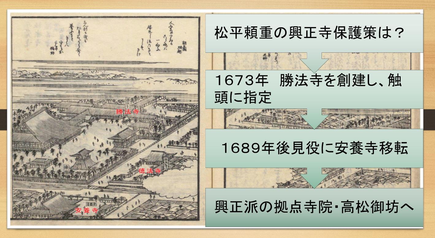 このように勝法寺は髙松藩における真宗興正派の拠点寺院として創建(移転)されたのです。そのため興正寺直属で、京都からやってきた僧侶が管理にあったりました。しかし、問題が残ります。勝法寺は、讃岐に根付いた寺院ではなく、末寺もなく人脈もなく政治力もありません。そのためいろいろと問題が起こったようです。そこで松平頼重が補佐として、後から後見役としてつけたのが常光寺と安養寺でした。そのうちの安養寺は、それまでの河内原からこの地に移されます。後から移されたので、建設用地がなくて堀の外側にあります。こうして高松御坊と一体の勝法寺、それを後見する安養寺と、3つの子院という体制ができあがったのです。御坊町はこうして、真宗興正派の文教センターとなっていきます。