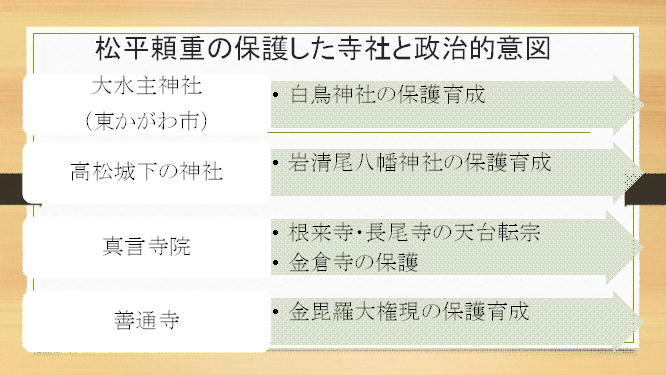 大きな勢力をもつ寺社は、藩政の抵抗勢力になる可能性がある。それを未然に防ぐためには、藩に友好的な宗教勢力を育てて、抑止力にしたい。それが紛争やいざこざを未然に防ぐ賢いやりかただ。それでは讃岐の場合はどうか? 抵抗勢力になる可能性があるのは、どこにあるのか? それに対抗させるために保護支援すべき寺社は、どこか?