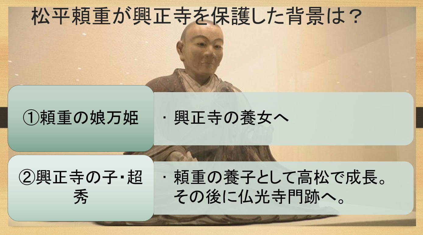 これ以外にも髙松藩と興正寺の間には、家老などの重臣との間にも幾重にも婚姻関係が結ばれて、非常に緊密な関係にあったようです。そのことをもって、松平頼重の興正寺保護の要因とする説もありますが、私はそれだけではなかったと考えています。政治的な意図があったと思うのです。