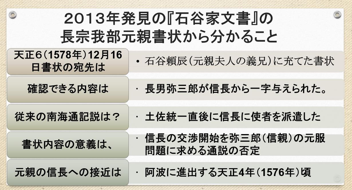 『元親記』によると、元親は天正8年(1580)6月に、弟の香宗我部親泰を安土へ送り、信長から四国は元親の手柄次第でいくらでも切り取ってよいという許しを得と南海通記は記します。しかし、先ほど見た石谷家文書からは、これよりも先に、長宗我部元親は信長に接近していたことが分かります。