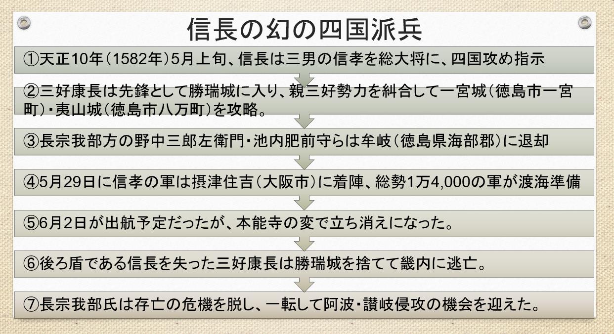 天正10(1582)年2月9日、三好康長に再度「三好山城守、四国へ出陣すべき事」の書状が信長から届きます 。今度は長宗我部元親を討つ四国遠征に先んじて再び阿波に渡たります。5月7日付の信孝宛の朱印状には、次のように記されています。