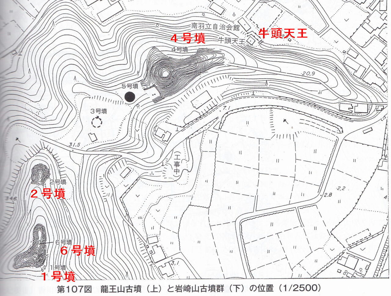 岩崎山4号墳の北側の麓には牛頭天王社(野護神社)が奉られ、そのそばに南羽立自治会館があります。地域の信仰センターの背後の霊山として信仰を集めてきたことがうかがえます。4号墳から南に伸びる尾根には、5号墳 → 3号墳 → 2号墳 → 6号墳 → 1号墳と5つの古墳が尾根沿いに造り続けられました。この中で消滅した3・5号墳以外は現地で墳丘を観察することができます。