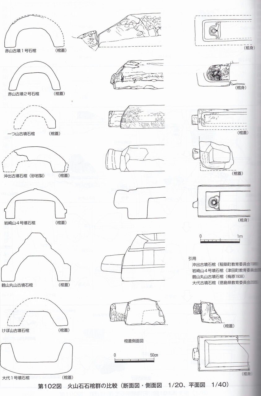 ①火山石石棺群の特徴は棺蓋は横断面が半円形を基本とし、両端部上面を直線的に斜めに切っていること②棺身は小口面が垂直であること③形態変化としては、棺蓋両端部上面を斜めに切った部分の傾斜角度が大きくなり、前後幅が狭くなっていくこと④その点に忠告すると注目すると、赤山1号石棺⇒赤山2号石棺⇒一つ山石棺⇒鶴山丸山石棺 → けぼ山石棺⑤棺蓋長側面の下部が平坦而を持たないものから内傾する平坦面、垂直な平坦面へと変化して、平坦面が強調され、幅広の凸帯になっていくこと⑥その点に注目すると赤山1号石棺 ⇒ 赤山2号石棺 ⇒ 一つ山石棺 ⇒ 鶴山丸山石棺⑦刳り込みの隅が曲線に仕上げられ稜をもたないものから鈍い稜線が目立つようになり、明確な稜線を持つようになること⑧その点に注目すると赤山1号石棺・2号石棺⇒一つ山石桔⇒ 岩崎山石棺・けぼ山石棺。大代石棺⑨刳り込みの中央部を両端よりも深くするものから平坦な底面への展開⑩その点に注目すると赤山1号石棺・2号石棺⇒ 一つ山石棺⇒ 岩崎山石棺・鶴山丸山石棺・けぼ山石棺