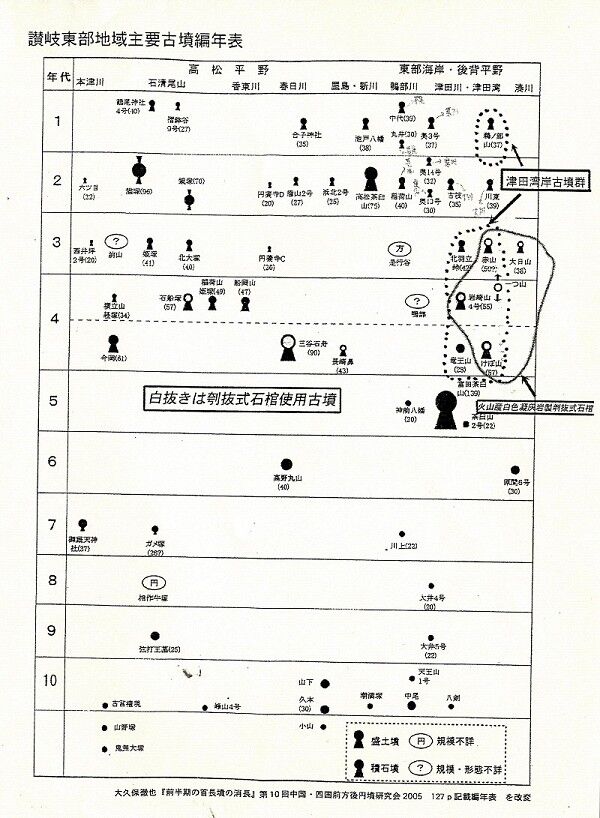 ①1期に各エリアに初期型前方後円墳が登場すること②3期になると前方後円墳は赤山古墳だけになること③その背景には津田湾周辺を巡る政治的な統合が進んだこと④5期には前方後円墳が姿を消し、円墳しか造営されなくなること⑤そして、内陸部に富田茶臼山古墳が現れ、他地域から前方後円墳は姿を消すこと⑥これは、津田湾から髙松平野東部にかけての政治的な統合が進んだことを意味する