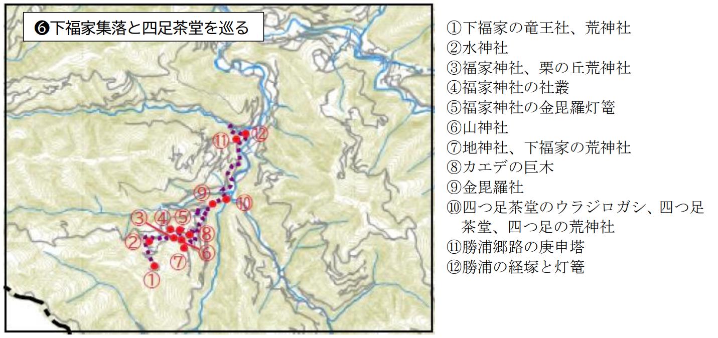 勝浦から下りてきた現在の長善寺の伽藍を右手に見ながら更に進み、勝浦集落への入口も越えて行く。しばらくすると「下福家バス亭」が見えてくる。ここから下福家集落に入っていく。