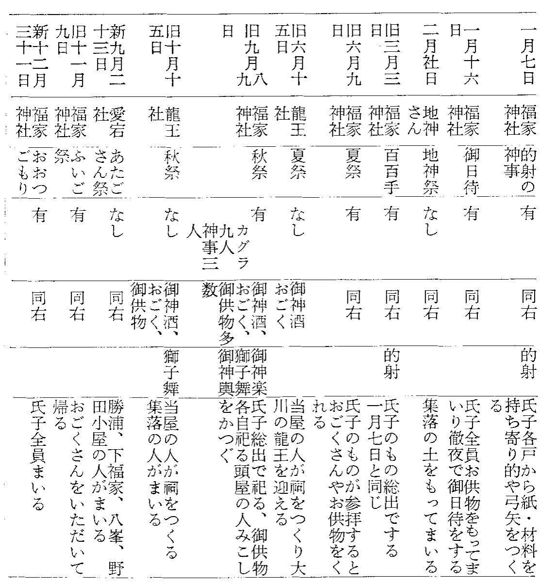 下福家は、全戸で二九軒(東8軒、中6軒、下8軒、西7軒)であるが、福家神社を中心に生活してきたことが、福家神社の正月の行事をみると明らかである。正月の元日の宮まいりは、大晦日の十二時が過ぎると氏子の者は皆神社に参るが、どの家も「おごくさん」を炊いて、ヘギに盛って持って来て祀る。