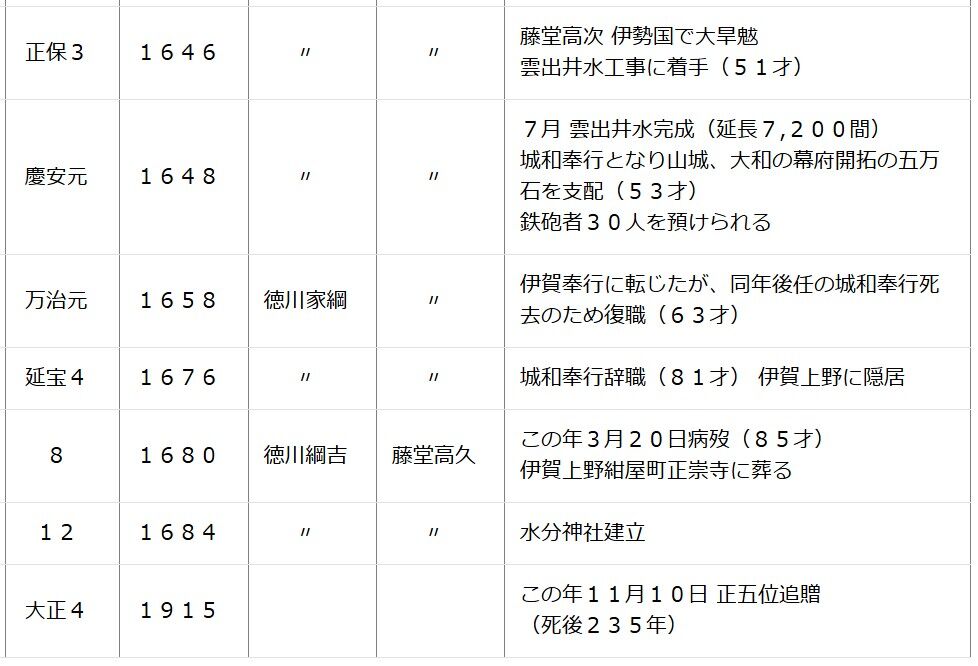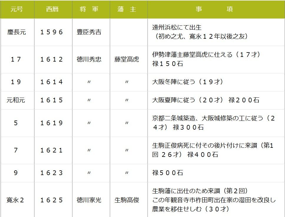 高松東濱から新川まで堤防を築き、屋島、福岡、春日、木太新田を開墾。1639年、一ノ谷池(観音寺市)が完成。生駒騒動の藩内抗争の中で伊勢国に帰郷。